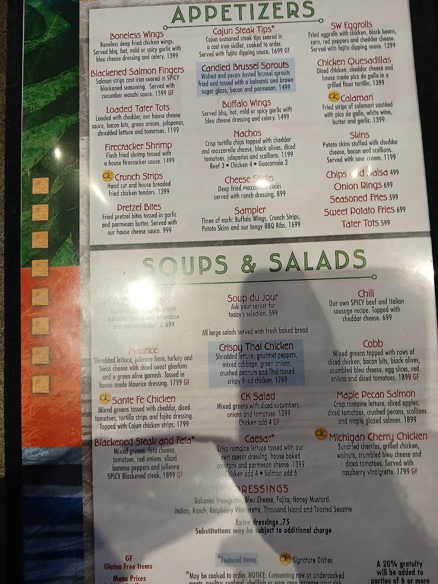 Mixed greens tossed with cheddar, diced tomatoes, tortilla strips and fajita dressing. Topped with Cajun chicken strips